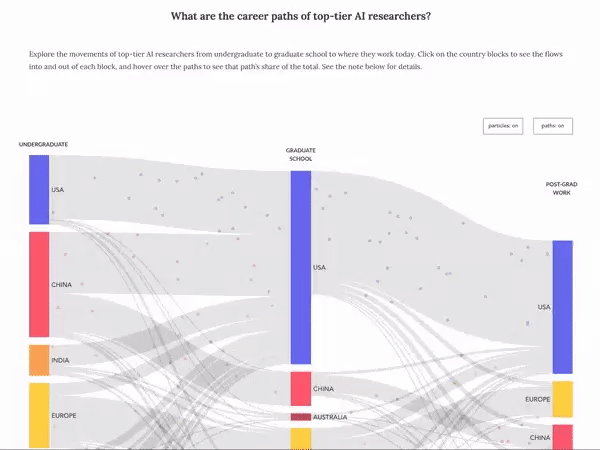 Top AI talent from emerging markets (primarily India and China) continues to flow towards advanced economies, primarily the USA and Europe. This may seem unsurprising given the nature of AI, but this is the most eloquent depiction I have come across.